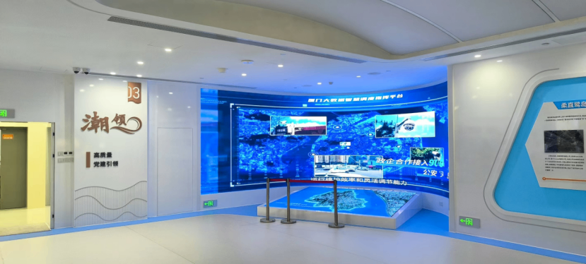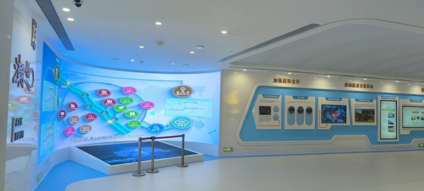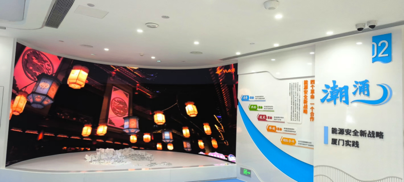 波浪形屏幕靈感源自“電力流動”與“鷺島潮涌”,象征某地市電網(wǎng)的活力與城市發(fā)展的脈搏,采用柔性LED曲面屏,弧度與展廳空間自然銜接,形成視覺焦點。